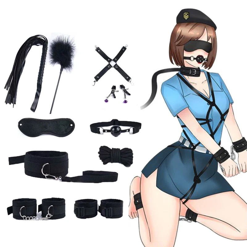 New 10 PCS/Set Nylon Women SM Bondage Sex Toys Kits with Short Plush Handcuff Neck Collar Flirting Stic